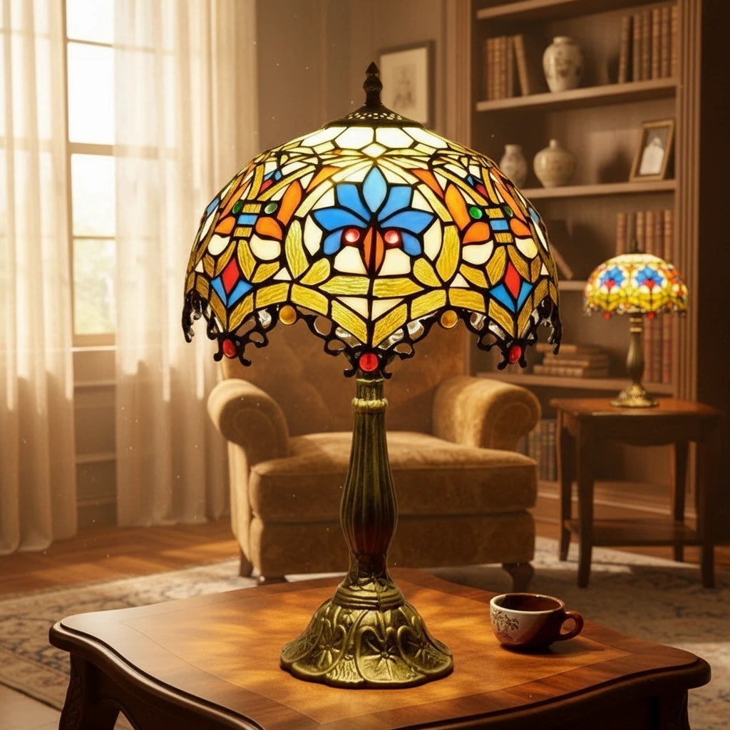 Bringe mit dieser eleganten Tiffany Tischlampe zeitlose Schönheit und warmes Licht in dein Zuhause. Jedes Stück ist handgefertigt aus echtem Buntglas und besticht durch kunstvolle Details im klassischen Barock-Design – perfekt für Schlafzimmer, Wohnzimmer oder Arbeitszimmer.
